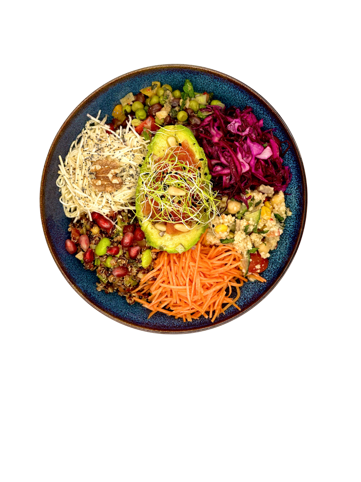 Aurora features a vibrant mix of colorful vegetables, including bell peppers, carrots, and spinach, combined with protein-rich quinoa and lean grilled chicken. A sprinkle of sunflower seeds and a light lemon-tahini dressing enhance the flavor and nutritional value, making every bite a delight.